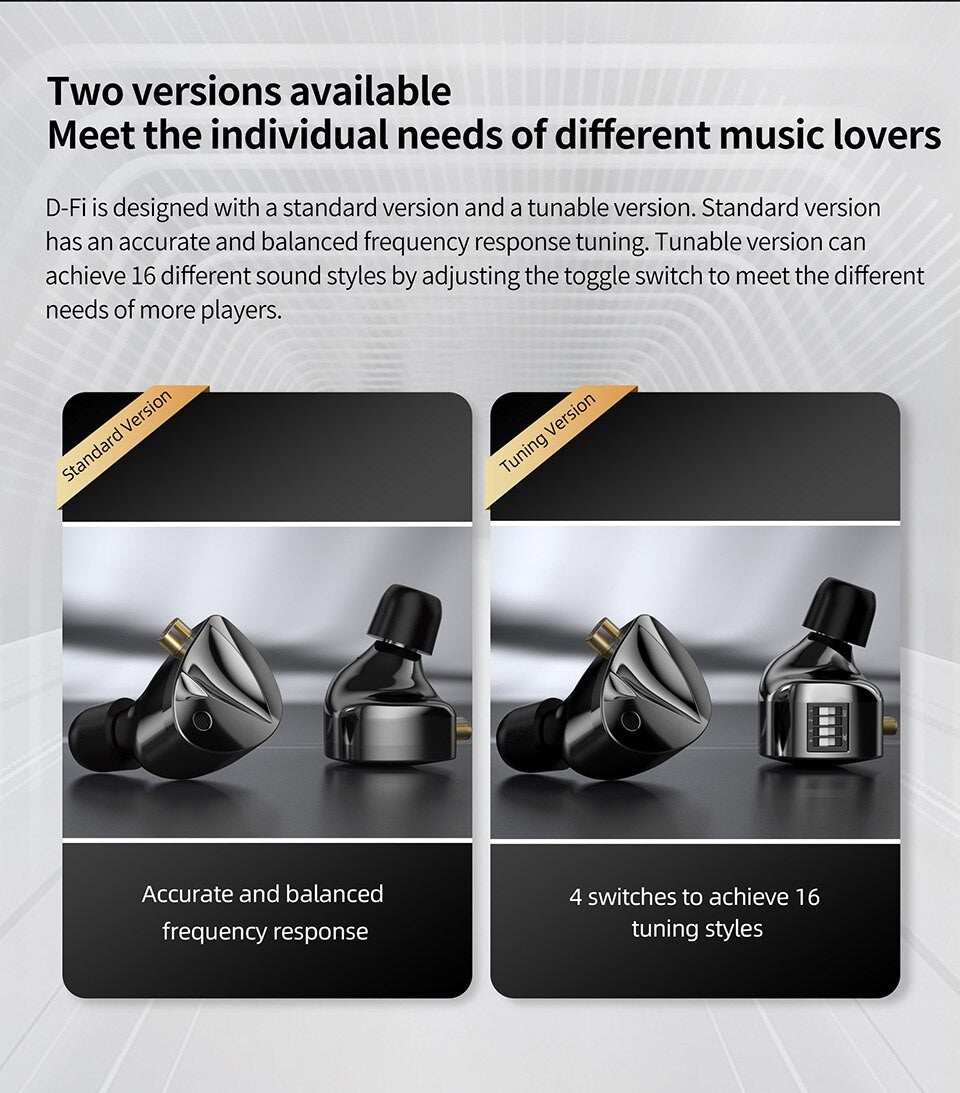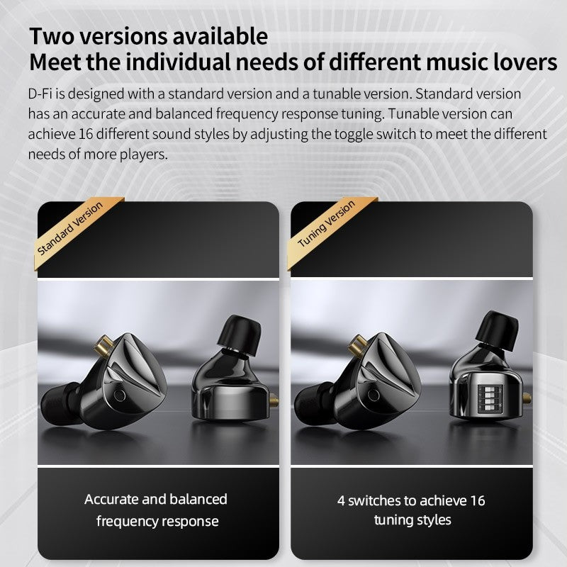 D-Fi é projetado com uma versão padrão e uma versão ajustável. Versão padrão tem uma resposta de frequência precisa e equilibrada. Tunablesversion pode atingir 16 estilos de som diferentes ajustando o interruptor de alternância para atender às diferentes necessidades de mais jogadores.
