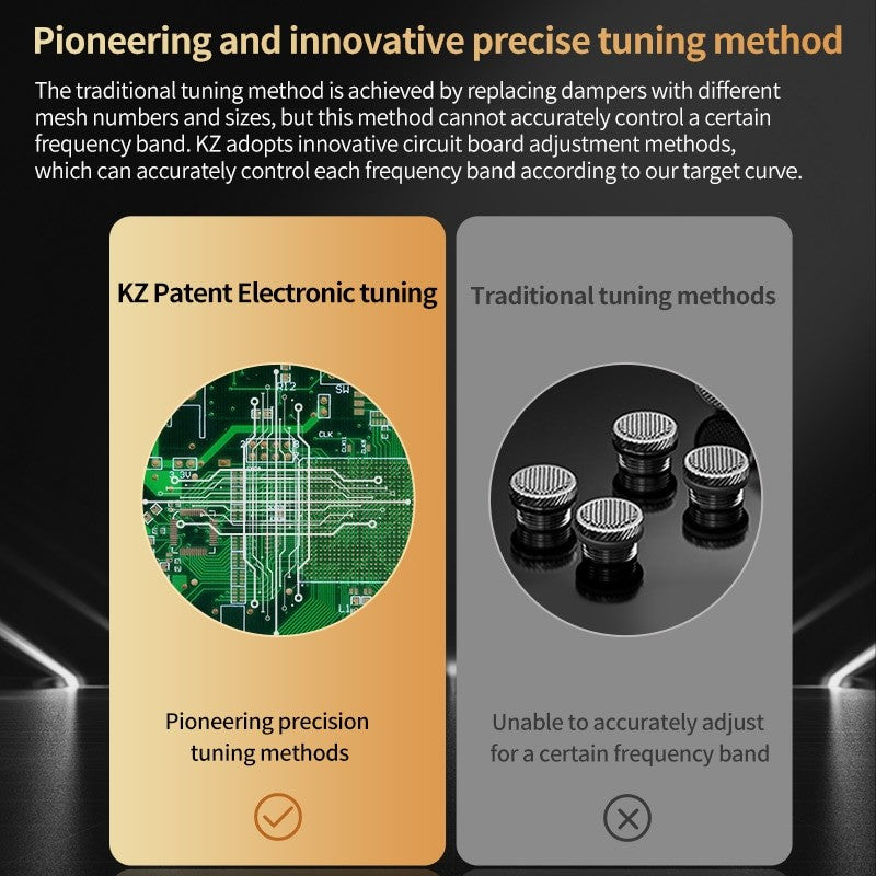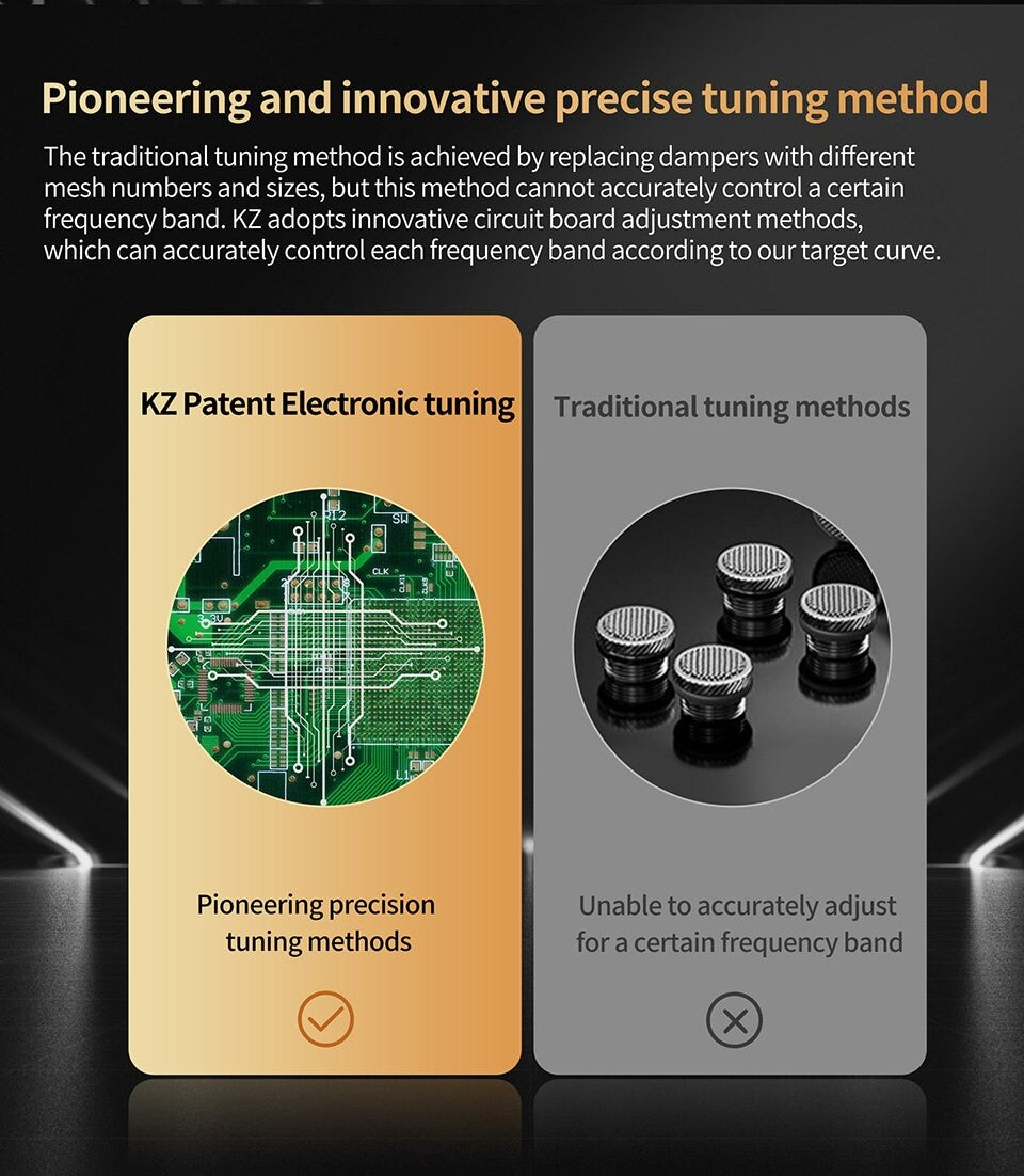 O método de ajuste tradicional é obtido substituindo amortecedores por diferentes números e tamanhos de malha, mas este método não pode controlar com precisão uma determinada banda de frequência. KZ adota métodos inovadores de ajuste da placa de circuito, que podem controlar com precisão cada banda de frequência de acordo com a nossa curva alvo.