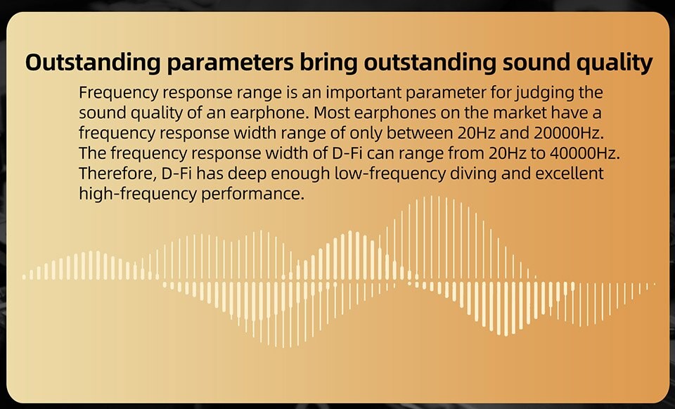 A faixa de resposta de frequência é um parâmetro importante para julgar a qualidade do som do anearphone. A maioria dos fones de ouvido no mercado tem uma faixa de largura de resposta de frequência de apenas entre 20Hz e 20000Hz. A largura da resposta de frequência do D-Fi pode variar de 7Hz a 45000Hz. Portanto, o D-Fi tem mergulho de baixa frequência profundo o suficiente e excelente desempenho de alta frequência.